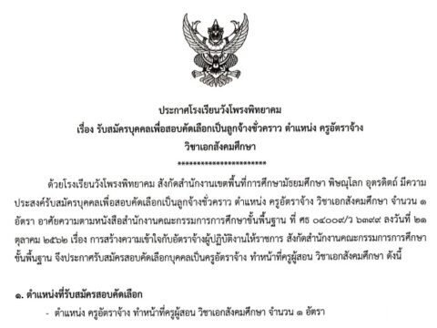 📢 ประกาศโรงเรียนวังโพรงพิทยาคม เรื่อง รับสมัครบุคคลเพื่อสอบคัดเลือกเป็นลูกจ้างชั่วคราว ตำแหน่ง ครูอัตราจ้าง วิชาเอกสังคมศึกษา