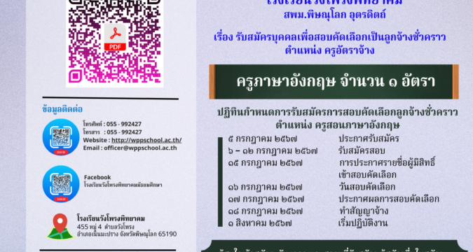 ประกาศโรงเรียนวังโพรงพิทยาคม เรื่อง #รับสมัครบุคคลเพื่อสอบคัดเลือกเป็นลูกจ้างชั่วคราว ตำแหน่ง ครูอัตราจ้าง #วิชาเอกภาษาอังกฤษ จำนวน ๑ อัตรา