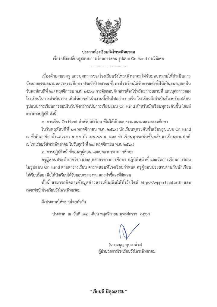 ประกาศเปลี่ยนรูปแบบการเรียนการสอนเป็น On Hand – วันที่ 27 พฤศจิกายน 2568