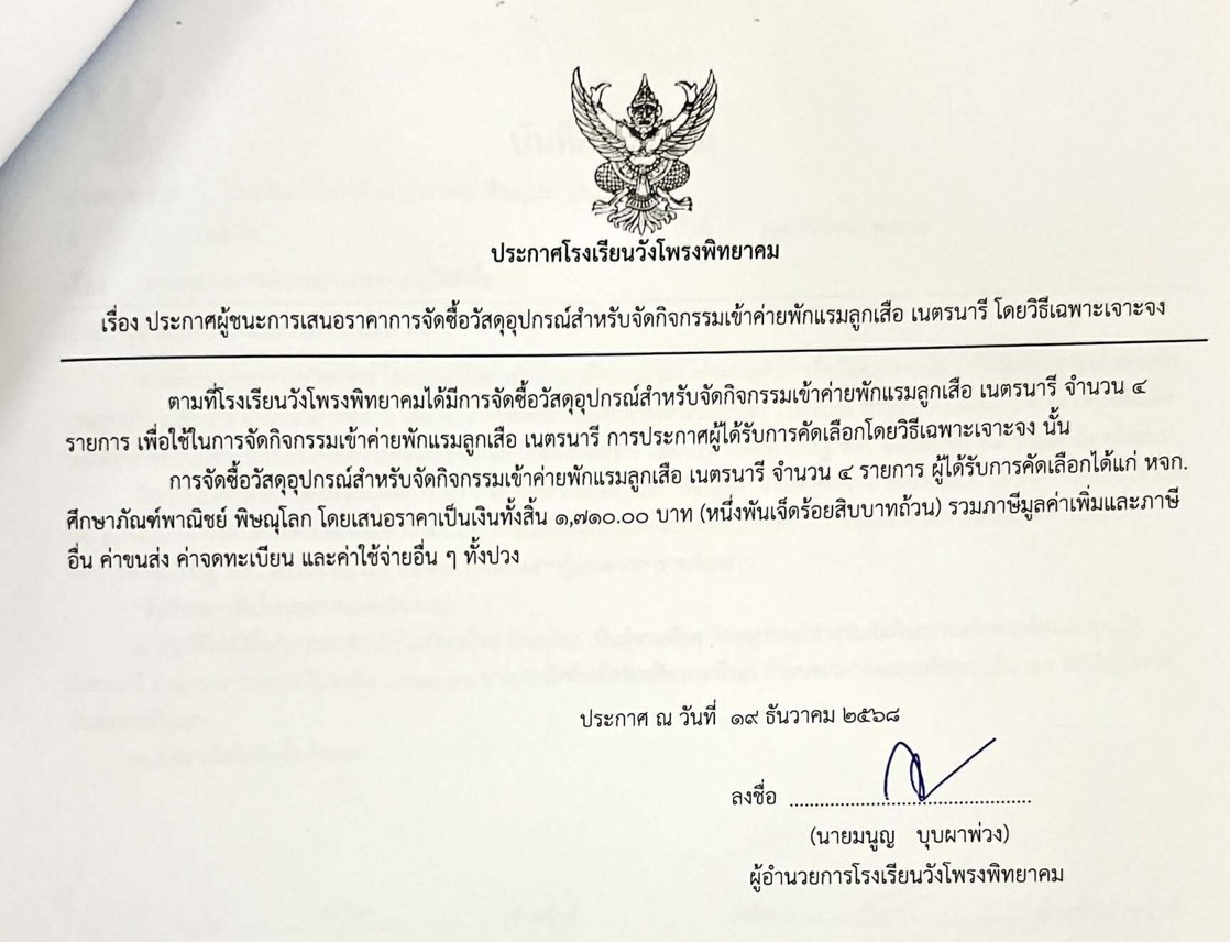 ตามที่โรงเรียนวังโพรงพิทยาคมได้มีการจัดซื้อวัสดุอุปกรณ์สําหรับจัดกิจกรรมเข้าค่ายพักแรมลูกเสือ เนตรนารี จํานวน ๔