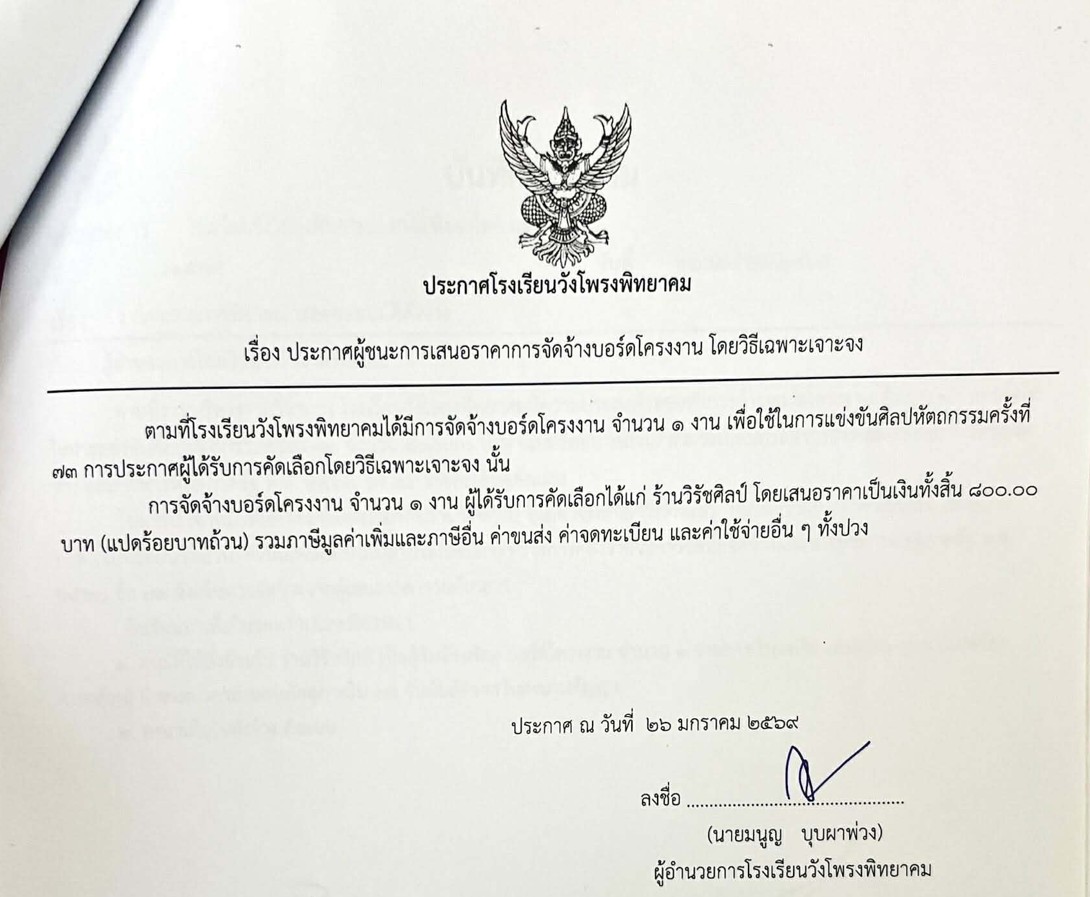 ตามที่โรงเรียนวังโพรงพิทยาคมได้มีการจัดจ้างบอร์ดโครงงาน จํานวน ๑ งาน เพื่อใช้ในการแข่งขันศิลปหัตถกรรมครั้งที่