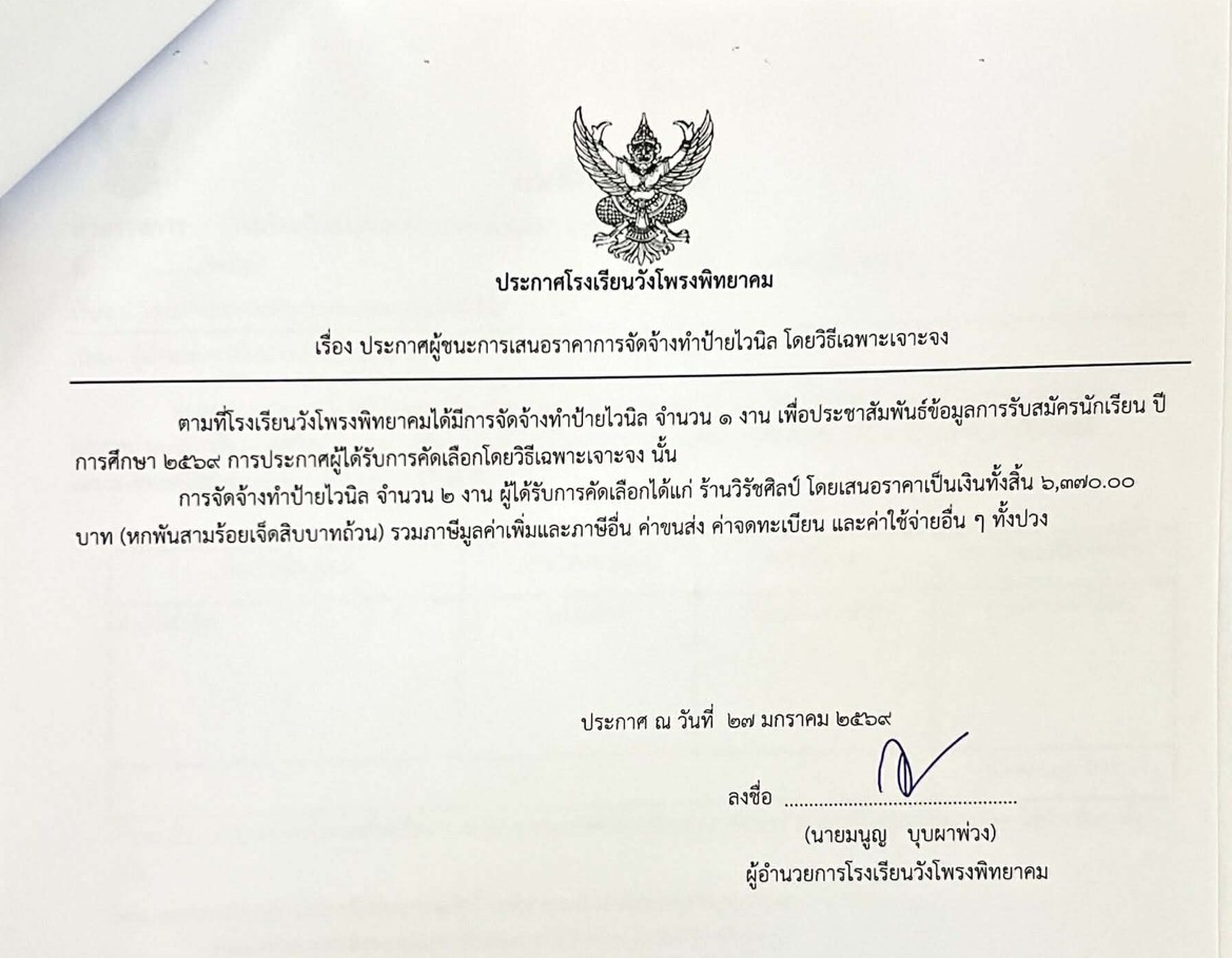ตามที่โรงเรียนวังโพรงพิทยาคมได้มีการจัดจ้างทําป้ายไวนิล จํานวน ๑ งาน เพื่อประชาสัมพันธ์ข้อมูลการรับสมัครนักเรียน ปี