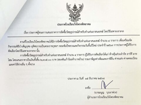 Author: ภัทรหทัย ทองอยู่ Published Date: 15 ธันวาคม 2025 Leave a Comment on ประกาศโรงเรียนวังโพรงพิทยาคม เรื่อง ประกาศผู้ชนะการเสนอราคาการจัดซื้อวัสดุอุปกรณ์สําหรับทําแท่นอาสนะสงฆ์ โดยวิธีเฉพาะเจาะจง